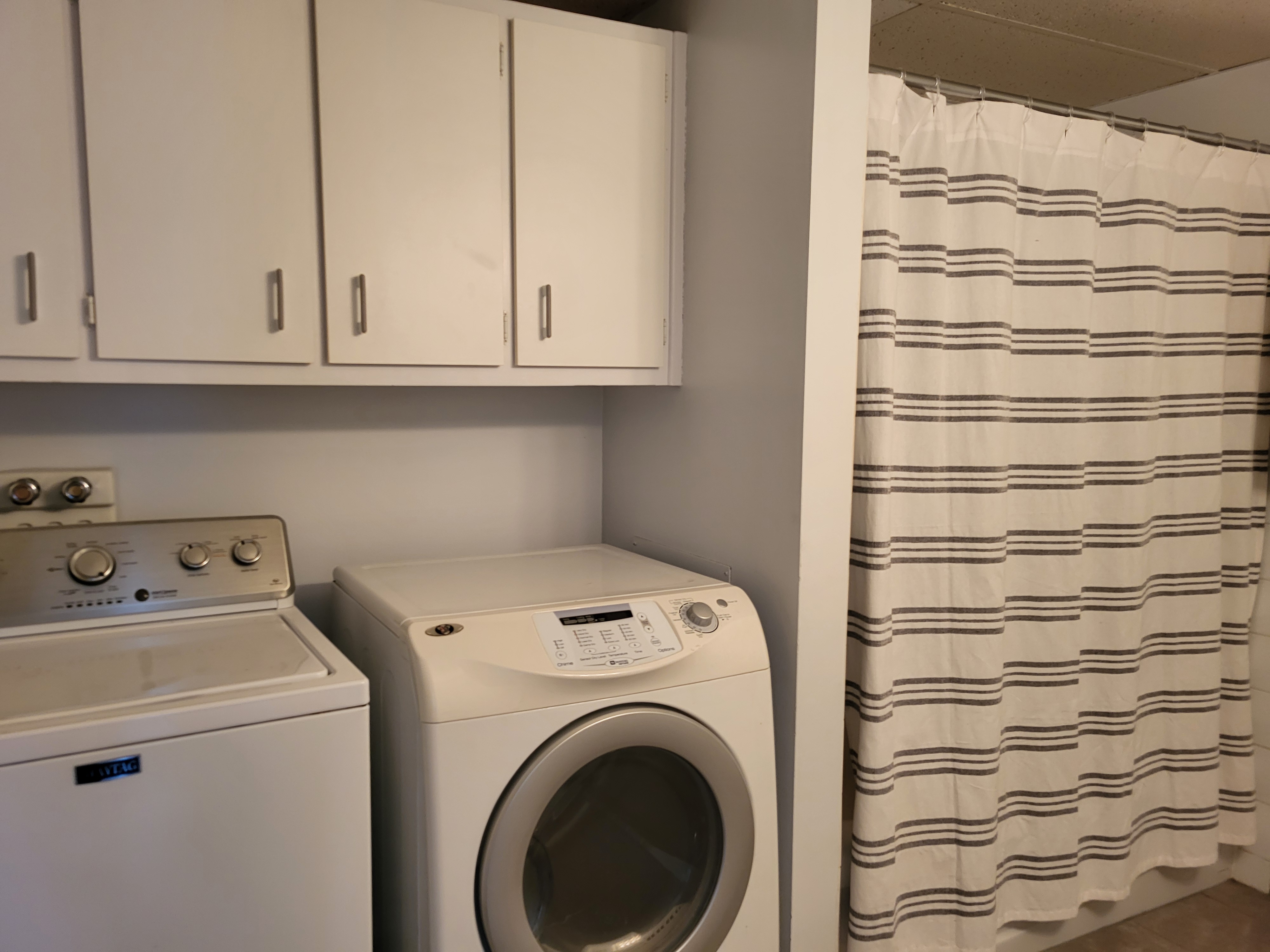 Grande salle de bain, avec entrée laveuse-sécheuse.